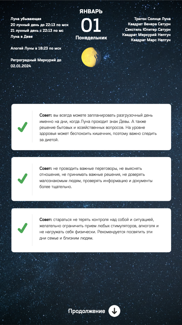 Точные прогнозы на каждый день и подробное описание каждого дня по нескольким аспектам.